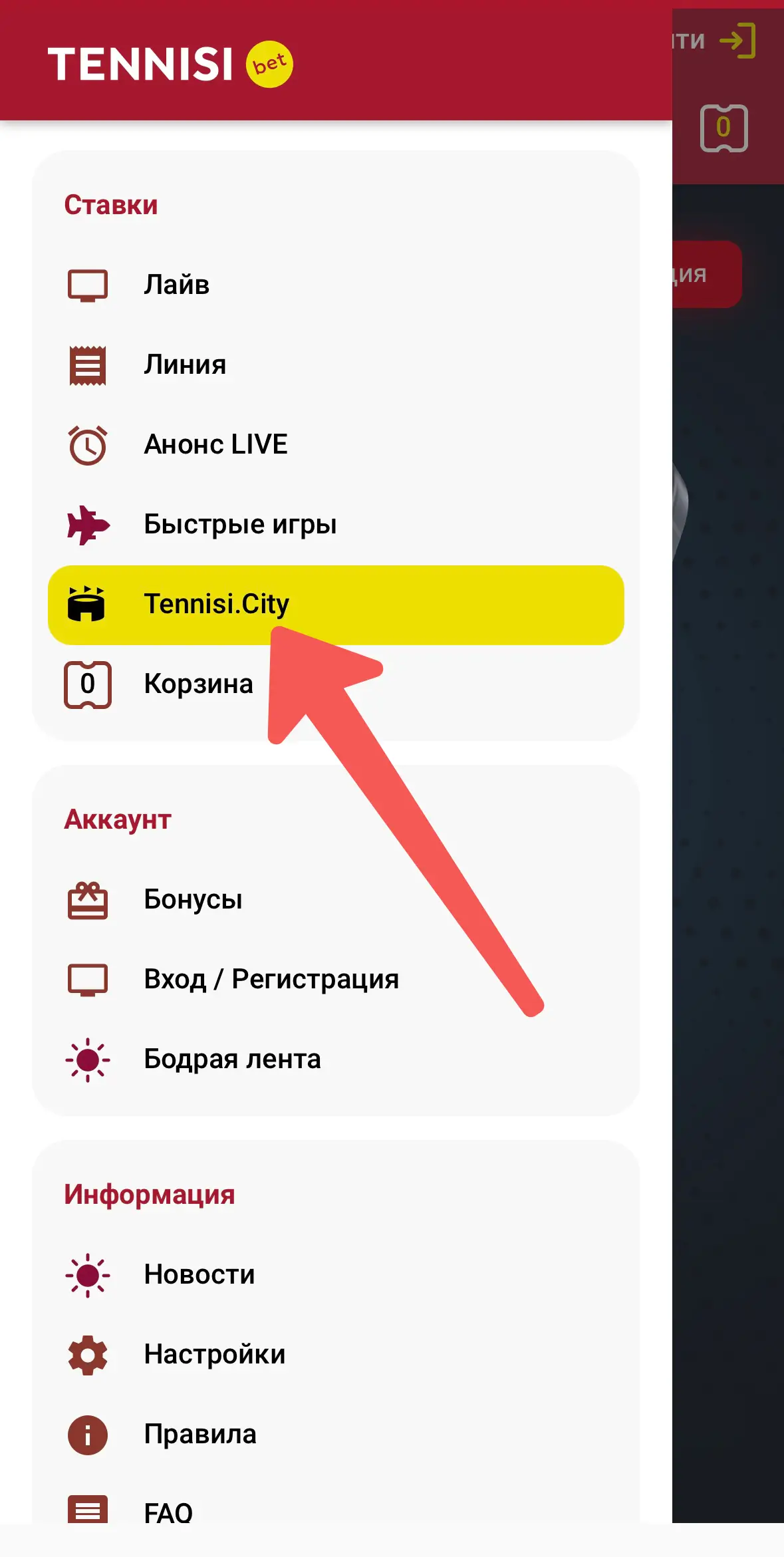 - зарегистрироваться в последней версии приложения БК «Тенниси», либо осуществить вход в имеющийся аккаунт;