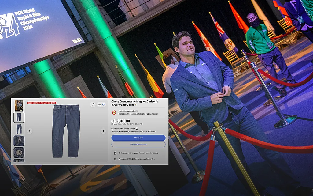 Магнус Карлсен выставил на продажу джинсы, которые привели к дисквалификации спортсмена на чемпионате мира по рапиду. Об этом шахматист заявил в своих соцсетях.